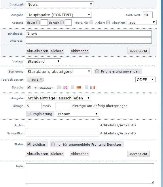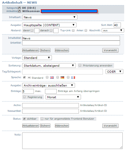 Die Einstellungen vom Artikel sind hier, Ich arbeite hier mit dem News-Modul: