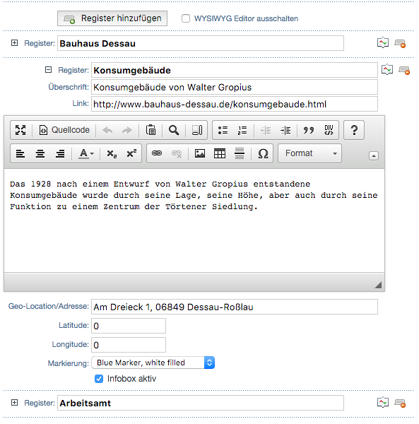 Eine wirklich feine Sache mit den neuen Features des ContentParts Register (Tabs), ich hab's je zwischenzeitlich auch schon "ONLINE im Einsatz", wenn auch für einen deutlich "einfacheren" Fall.